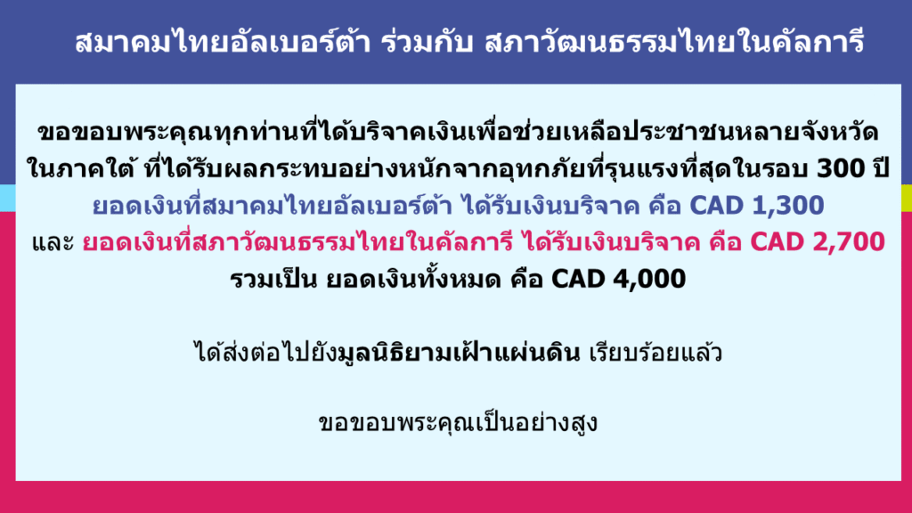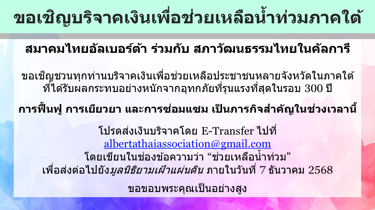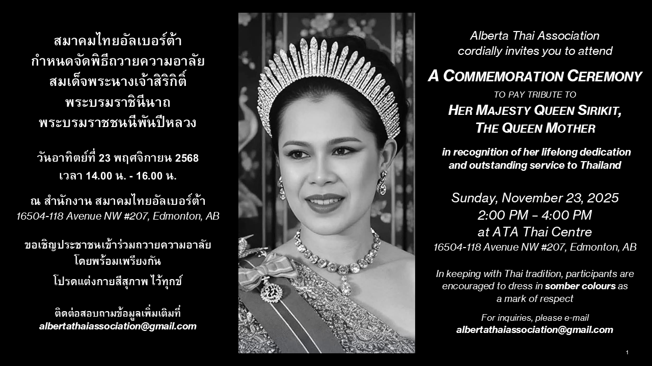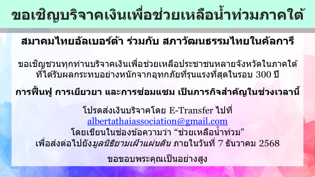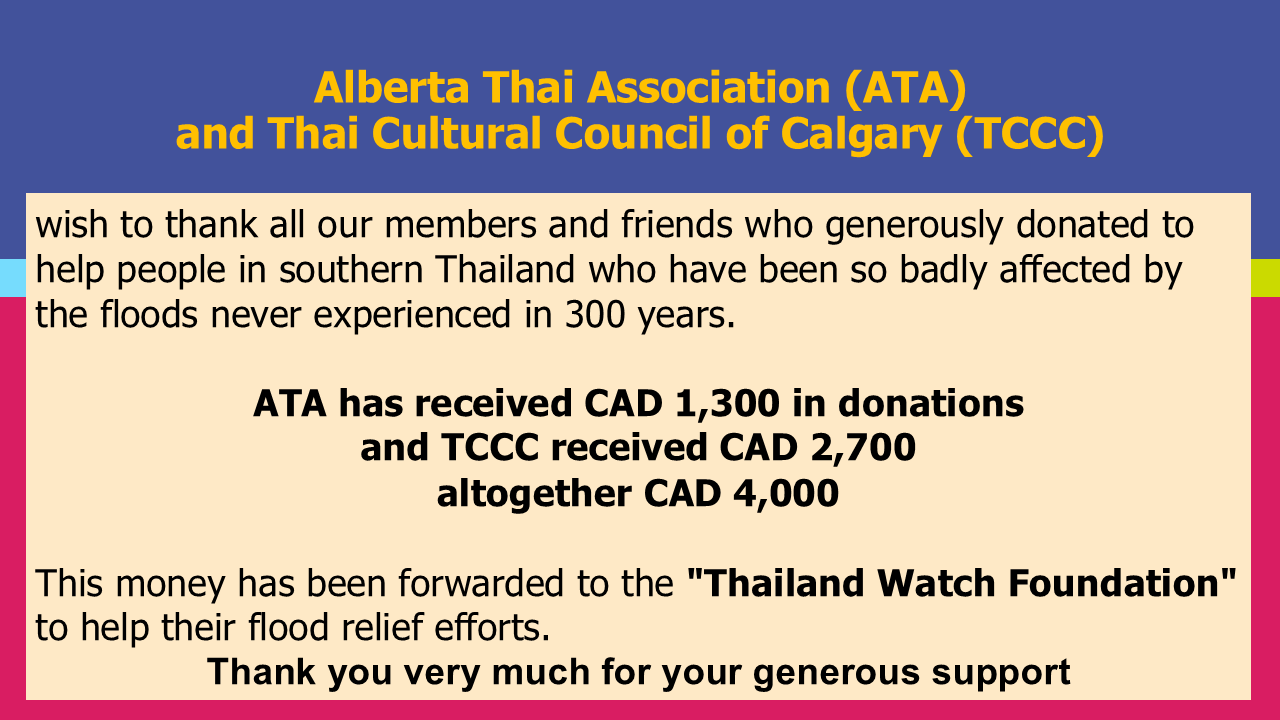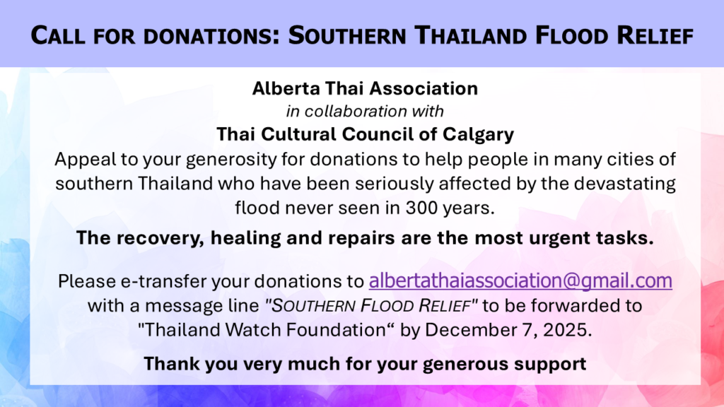 The ‘Alberta Thai Association’ is an Ethno-Cultural Non-Profit Organization registered under the ‘Societies Act of Alberta’. Established in 1985, it has been serving the Thai Community and the Multicultural Community at large in the areas of cultural, educational, recreational programs and social activities for more than 30 years in the greater metropolitan Edmonton area.
