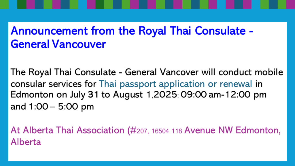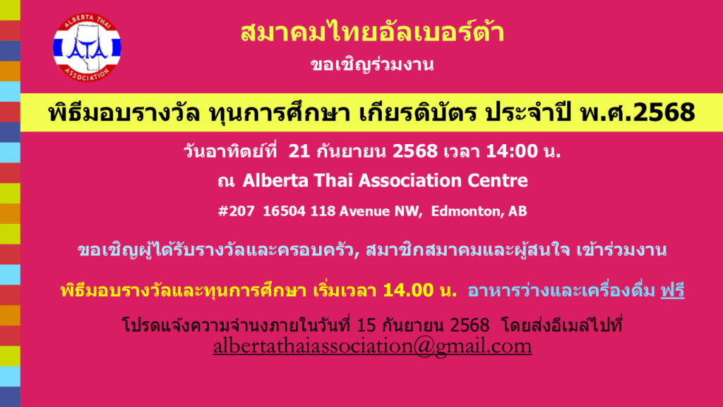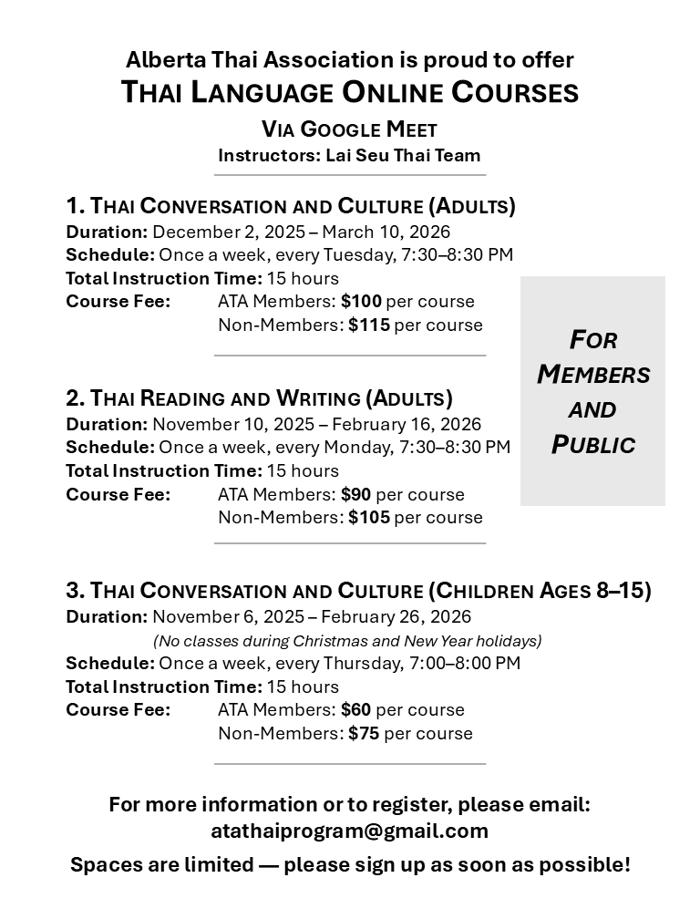 Please follow important news or announcements on our website at albertathaiassociation.com